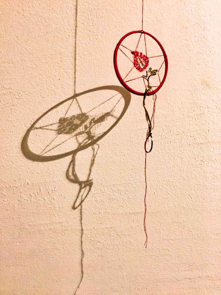 The thread dives into a dye and dries the colour on its skin; it boards into a loom and gets reading to be fabric. The spindle whirls. The shuttle runs. The loom swooshes, clacks, and swishes. It feels becoming dot, line, square, leaf, tree, beast, birds and so on. Yarns continue to twist and bend, but yet to find its end and embrace the cadence. Hitherto, the yarns quietly move with the shuttle, spindle and loom to feel an arrival of the fabric...